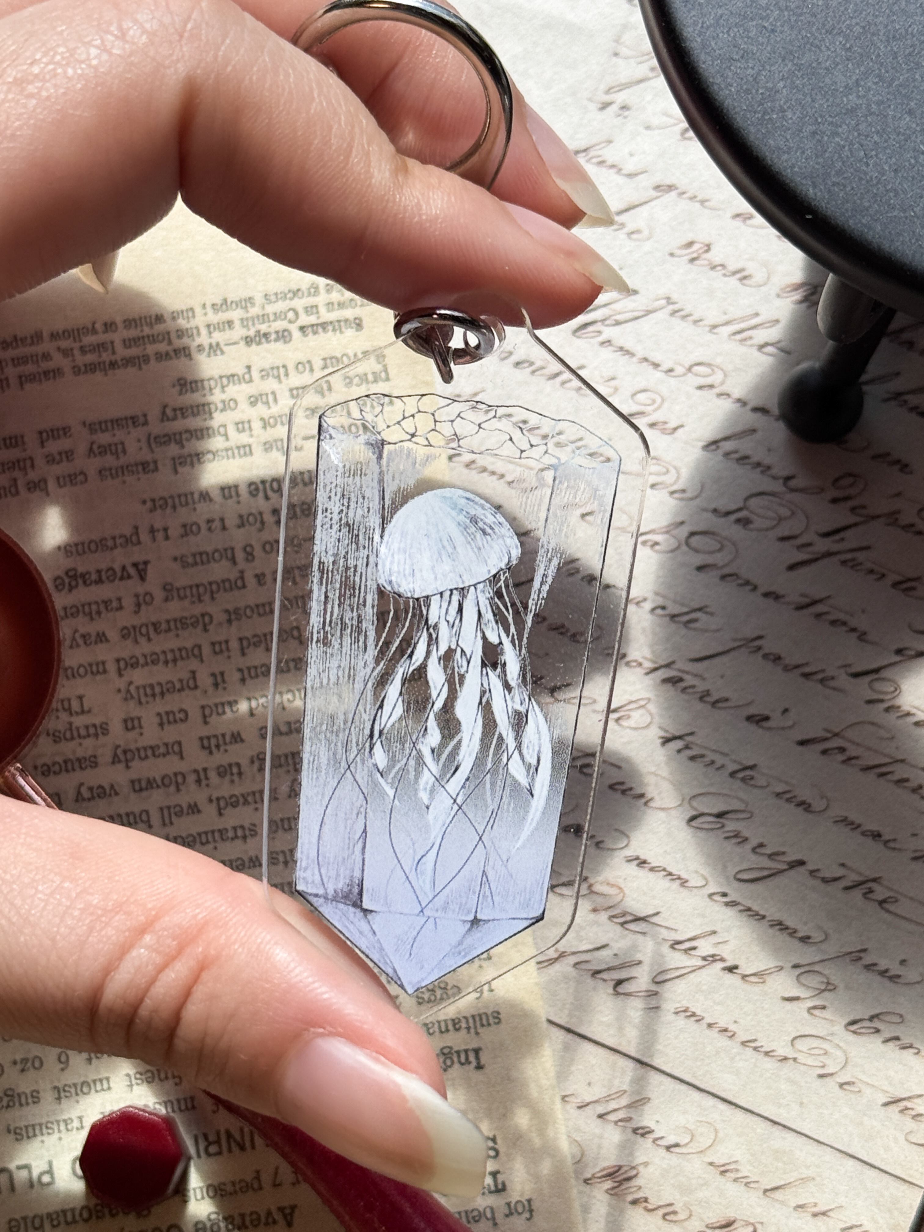 【再販】クラゲの水晶標本イラストアクリルキーホルダー60mm|ナスカン・透明タイプ